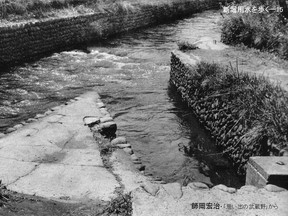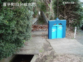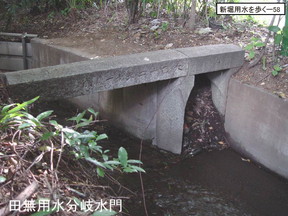 | す。現在あるのは昭和40年代に付けられた鉄の扉ですが、それまでは 板を落として水量を調節した。その前は木の枠を埋め込んで、枠の面積で調節していた、 といろいろと水門も変化しています。 |