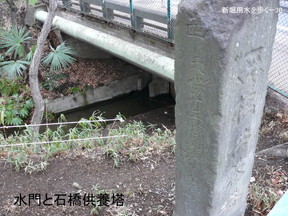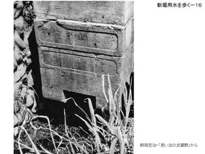 別の写真にこちらの野火止用水のところがアップで写っています、箱の所に文字が彫って