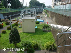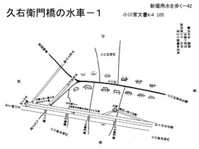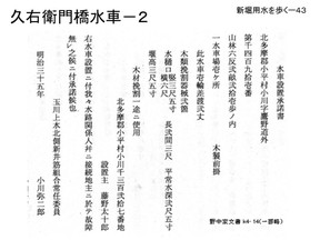 トは残っています。現在でもこの海老樋の落差が2〜3m位あります。先頭へ これは別の「海老樋」の写真です。柴崎分水、立川の一番町の所に残っているのですが、 上流の方は現在マンションになっていますが、300m位手前から勾配を緩めて水位を稼 いで水を落としているようです。水車を止める時には、ここに堰がありますが、ここに板 を入れて流れを止める、そうすると水車も止まり、横から水を本流に流す構造です。 あと久右衛門橋の北側に水車があったとされています。はっきりしたことは分かりませ ん。水車を掛けるには新井筋用水組合に届け出て許可を受けなければなければならない。 その書類が残されています。小川字鷹の街道外194番地、丁度今の津田塾大の所になり ますが、そこに明治35年に水車を設置するので北側新井筋の組合に許可を求めた時の文 書です。実際建てられたかどうかは分かりません。この水車の特徴は木材の引き割り用の 水車を掛ける、となっています。小平のほとんどの水車は精米・製粉です。このほかこの 付近の別の水車絵図が残っていますが関連ははっきりしません。 この写真が清水水車、現在の桜橋の近くにあったもので、昭和9年の写真です。左側が 新堀用水です。ここに海老樋があった。海老樋跡ですがここもやはり半地下になっていま す。最近お宅を建て替えられたので今は全く残っていません。 |