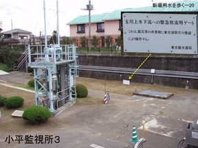 | らここから下流の玉川上水に今流れている水は、羽村からここま で流れて来た水とは全く違うものです。何回話しても勘違いされる方が多いのですが、こ の水は全て東村山浄水場に行く。例外として一部が、これが東村山浄水場に行く水門なの ですが、この脇の所にちょっとバブルみたいなのがあります。先程の水門の脇を流れてき た水がここからさらに下流に行くようになっている。ここに看板があるので拡大してみる と「玉川上水下流への緊急放流ゲート」とあります。このゲートから先程の側水路を通っ てきた水が、いつでも玉川上水の下流に流れるように作られています。水門は常時締めら れたままです。この水門は大きな災害時に消防庁が防災用にどうしても必要な場合は開け るがそれ以外は開けませんということです。確か |
