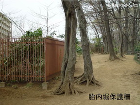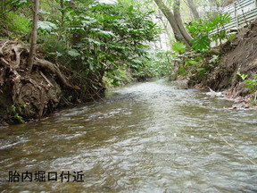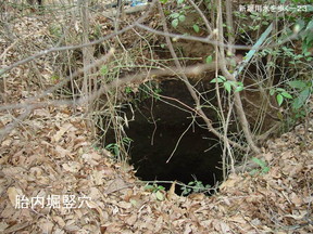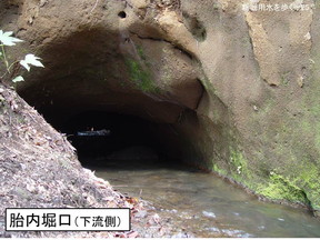 こえたりします。 何でこんな胎内堀にしたか、理由ははっきりしないのですが、堀の幅が大体1mちょっ と、底の段面積が三尺×三尺、 |