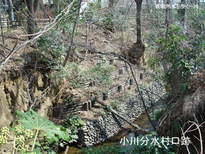 た。現在は塞がれています。先頭へ これは千川上水の分水口です。明治4年に新堀用水 から分かれて新しく作られた分水口です。この基本の形は先程の写真とよく似ています。 両側は玉石積の壁があって、真中に衝立みたいにせり出し、そして分水口。後ろの堰は大 正13年に作られた。この頃新しく多摩湖経由で新設された境浄水所に導水されるように なったので、玉川上水の水量が減るということを懸念して各分水口の人達が要請して新し く作られたものです。ここに板を並べて水位を高くして分水口に水が入りやすいようにし た。こういうのがまだあちこちの分水口に残っています。先程の分水口とちょっと似てい て、現在まだ残されていますので、先ほどの写真と比べてご覧いただきました。 |