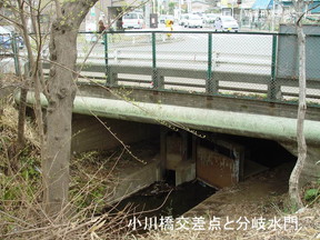 | この写真は喜平町にある大沼田・鈴木・野中用水への分水口です。今年の3月に位置が やや東に変わって水路も一部新しくなりました。古くは合併口と呼ばれた分岐水門です。 |