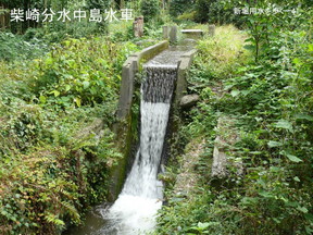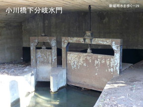 えたりして、このときに仲良く二つの分水口が並んだ、ということが読み取れます。 全く別の場所の写真ですがここに似たような分水口の写真があります。最近撮ったもの です。先程の写真と比べてもらうと分かるのですが、中央が流れになって、後ろに堰がありま す。手前に取り入れ口がちょっと突き出していて、この巻揚げ機、先ほどの野火止用 水や新堀用水の写真では開閉の金具は取り外されてありませんが、ここから水を取り入れ ていまし |