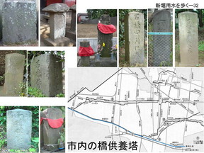 供養塔には東西南北、右 江戸みち、左 所沢・山口、と示され道標も兼ねています。 石橋供養塔の目的と言うのは、単に人馬に踏まれる橋を供養するということだけでなく て、大金を掛けて石橋がやっと出来たという完成の記念碑みたいなものです。あとは橋を渡って 村々にいろいろな災いとか疫病が入ってくるのを防ぐ「塞ぎ」という意味もあり ました。また、この供養塔のように道標も兼ねるものもありました。小平市内の用水路を 歩くとこの写真のように11の碑があります、写真の一番左は今は江戸東京たてもの園に 移されています。こういう供養塔があるので、それを探して歩いても面白いと思います。 これは大正9年の小川橋の写真です。ここに何か建っていますがこの石橋供養塔です。 資料では現在と違って昔は道の東側にあったそうです。先頭へ |