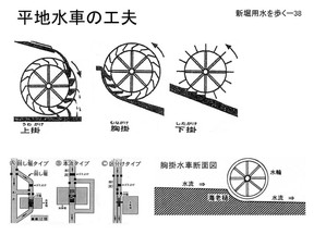 | 位を稼ぐために本流に対し て緩い勾配の「回し掘り」を作った。また「胸掛式水車」という工夫がされた。「胸掛式」 というのは水車の上から水を掛けるのではなくて水輪の途中、横から掛ける、この樋 |