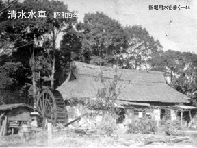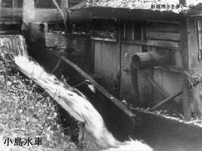 て新堀用水に戻したと言われています。この写真は昭和25年頃の小島水車です。シャフ