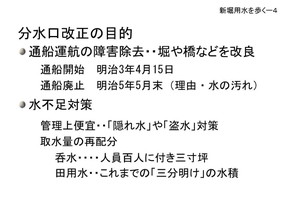 ついては大きく二つが言われています。 分水口改正の目的の一つとして言われているのが、明治3年4月から明治5年の5月ま で玉川上水には船が通っていました。荷物の運搬、人も乗ったということです。約三間幅 の玉川上水に約一間幅の船を通すということになり、分水口があちこちにあると船の運行 の邪魔になるので分水口を減らすために改正が行われたのだといわれています。 もう一つの目的は取水量の再配分、これは水不足対策です。私はどちらかと言うとこち らの水不足対策の方が大きな |