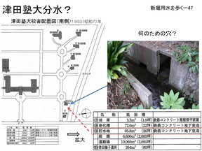 | これは津田塾大学の横の水路の写真です。新堀用水の方にこんな穴があるのですが、こ れは津田塾大学への分水口か?創設期の大学の図面ではこの位置に26坪の地下貯水槽が ある。昔 |