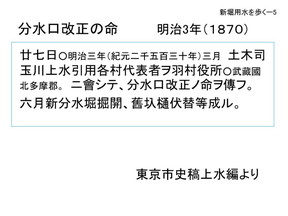 | 「分水口の改正の命」と出ていますが、これが東京市史稿の中に出ている正式な改正の 通達です、かなり難しい字が使われていますが、明治3年、ここに紀元2530年、この 頃の文書は紀元何年なのですが、この3月に「土木司」という役所に玉川上水から水を引 いている各村の代表が集められた。羽村の役所、現在の羽村の取水所のある所だと思いま す、武蔵国北多摩郡と注釈がありますがここに集められ、分水口改正の命令がそれぞれの 村の代表に伝えられた。さらに続けてその年の6月に「新分水堀掘開舊圦樋伏替等成ル」、 とありますから6月にはそれらの工事が完了して実際に使われだしたと、かなり短い期間 に工事が行われて分水口が新しく変わったということが分かります。これによって出来た 堀の一つが新堀用 |
