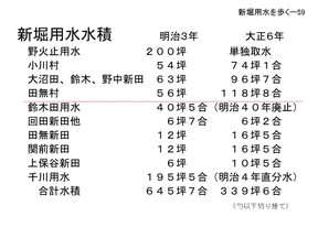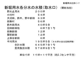 | 先程出てきました新堀用水に関係する村々の分水口の大きさをざっと表にあらわすとこ のようになります。中で多いのは野火止用水の200寸坪。野火止用水かなり大きいなと 思うのですが、野火止用水が出来た時には玉川上水の水量の三分。三分という表示をどう 読むかで変わってくるのですが、三分の一という取り方と、三割という取り方の二通りの 解釈の仕方が今あります。玉川上水最大の分水口でした。それが減りに減らされて200 寸坪にされてしまう。これについては野火止用水を使う村々は猛反対を起こしましたが詳 しくは後半にお話します。それから小平で一番大きい小川村、青梅街道の両側を流れてい ますが、これは54寸坪。それから大沼田・鈴木・野中新田には現在の喜平橋の手前のと ころから新しい分 |