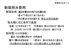 | 新堀用水に掛った費用もかなり細かく出ています、現在の小平の監視所の所から武蔵境 の所まで新しく堀を掘ったり、または既にある堀を広げたりと、そういうのが各村々に割 り当てられて工事が行われたわけです。それに掛った金額が銀28貫654匁と細かく出 ている。その中に野火止用水の方には負担を別にするということがわざわざ書かれている。 これについては後でお話します。各村々取水量の割合で費用を負担しています。小川村で いいますと、分水口の大きさが54寸坪ですので、一寸坪当り単価「銀42匁8分1厘9 毛」ということになり、掛け算すると「銀2貫312匁2分」と金額が出てくる。当時銀 と金の換算率は年々変化し、また明治4年になると円単位に替りますので、今の価値にし てどの程度かはなかなか比較 |